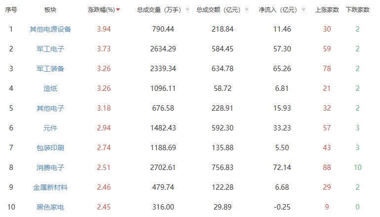 中国经济网,北京,12月24日。今天A股三大股指集体收高。截至收盘,上证指数报3940.95点,涨幅0.53%,成交额7739.29亿元;深证成指报13486.42点,上涨0.88%,成交额11063.40亿元;创业板指数报3229.58点,上涨0.77%,成交额5025.69亿元。板块方面,其他供电设备、军工电子、军工装备等板块涨幅居前,贵金属、保险、白酒等板块跌幅居前。 A股市场板块盈亏排名
